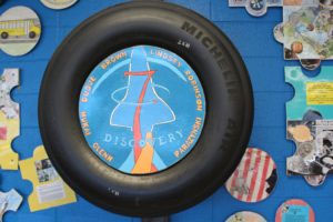 The Abington Heights Middle School began an extraordinary project in 2009 led by art teacher, Karen Taylor. The project involved the creation of a thematic mural designed around a main landing gear tire from the Space shuttle STS-flight 95, which was from John Glenn’s last mission on loan by NASA. The effort to create this mural involved 5th grade students at the Abington Heights Middle School who had been learning about space exploration and the fusion of art and science with the help of the visiting artist-in-residence, Nikki Moser.