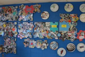 The mural was created from a collection of puzzle pieces that contain scraps of photos and information on space exploration and its effect on everyone’s life on earth. Not only did the students learn about NASA, but they also learned how artists incorporate information from diverse subject matter in order to illustrate concept.