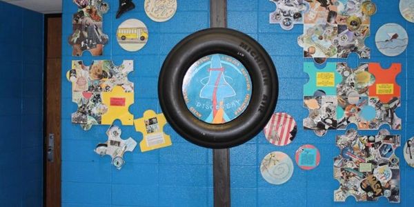 We began this extraordinary project in 2009 led by art teacher, Karen Taylor. The project involved the creation of a thematic mural designed around a main landing gear tire from the Space shuttle STS-flight 95, which was from John Glenn’s last mission on loan by NASA. The effort to create this mural involved 5th grade students at the Abington Heights Middle School who had been learning about space exploration and the fusion of art and science with the help of the visiting artist-in-residence, Nikki Moser.